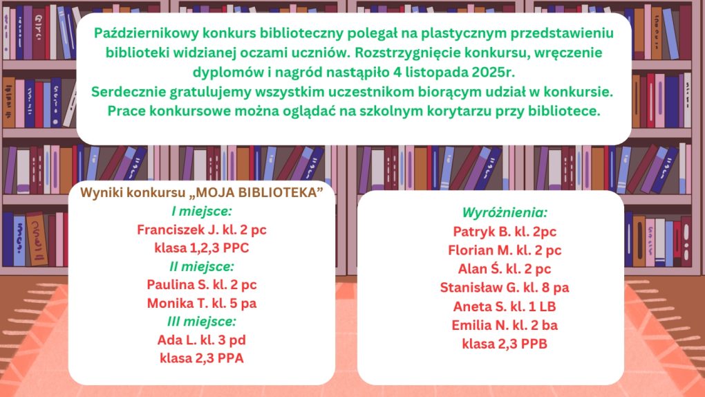 W październiku uczniowie naszej szkoły wzięli udział w konkursie plastycznym „Biblioteka widziana oczami uczniów”. Ich prace zachwyciły pomysłowością, kolorami i wyjątkowym spojrzeniem na nasze szkolne miejsce pełne książek i wyobraźni.